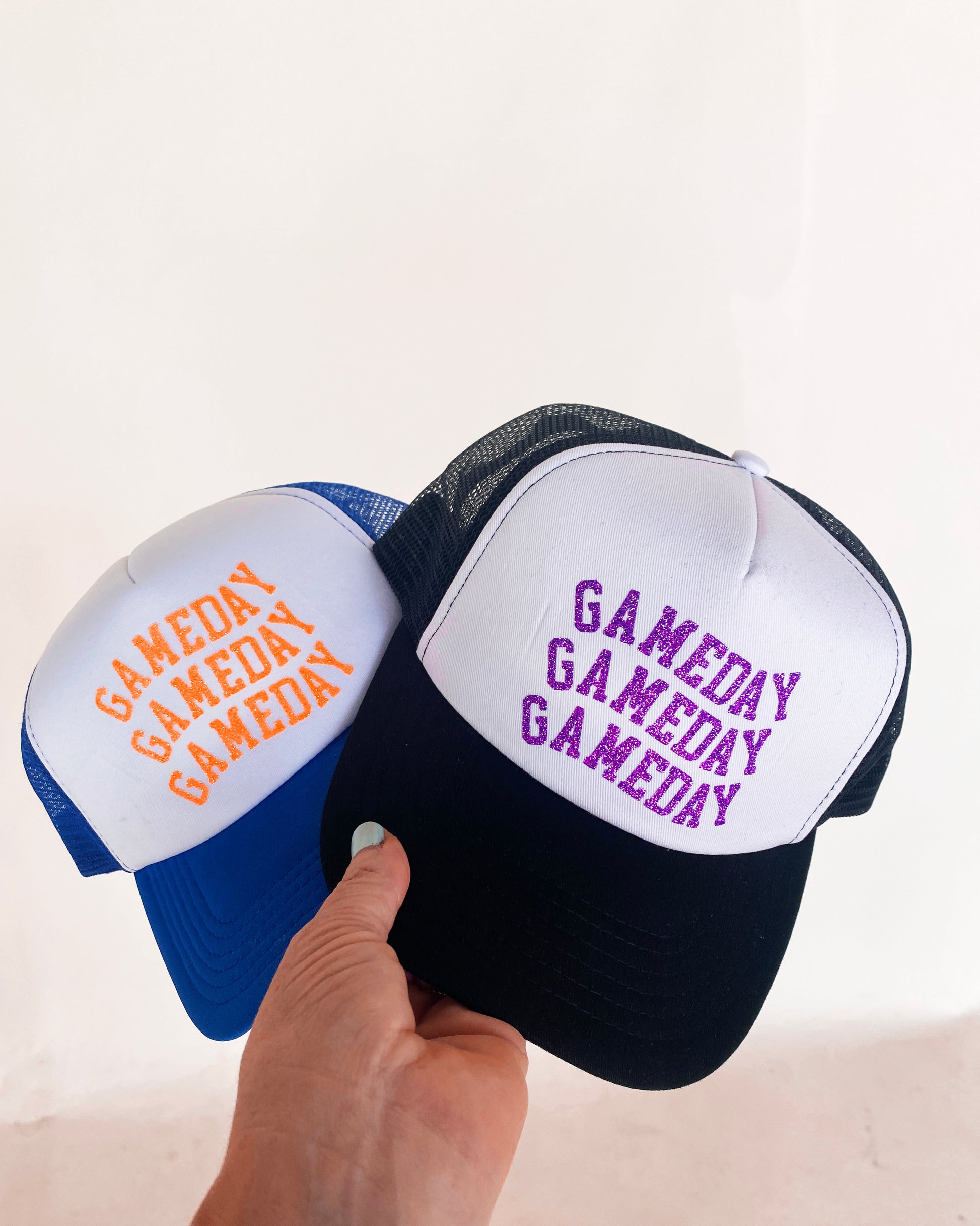 Gameday Three hat features three wavy retro gamedays on front of trucker hat.