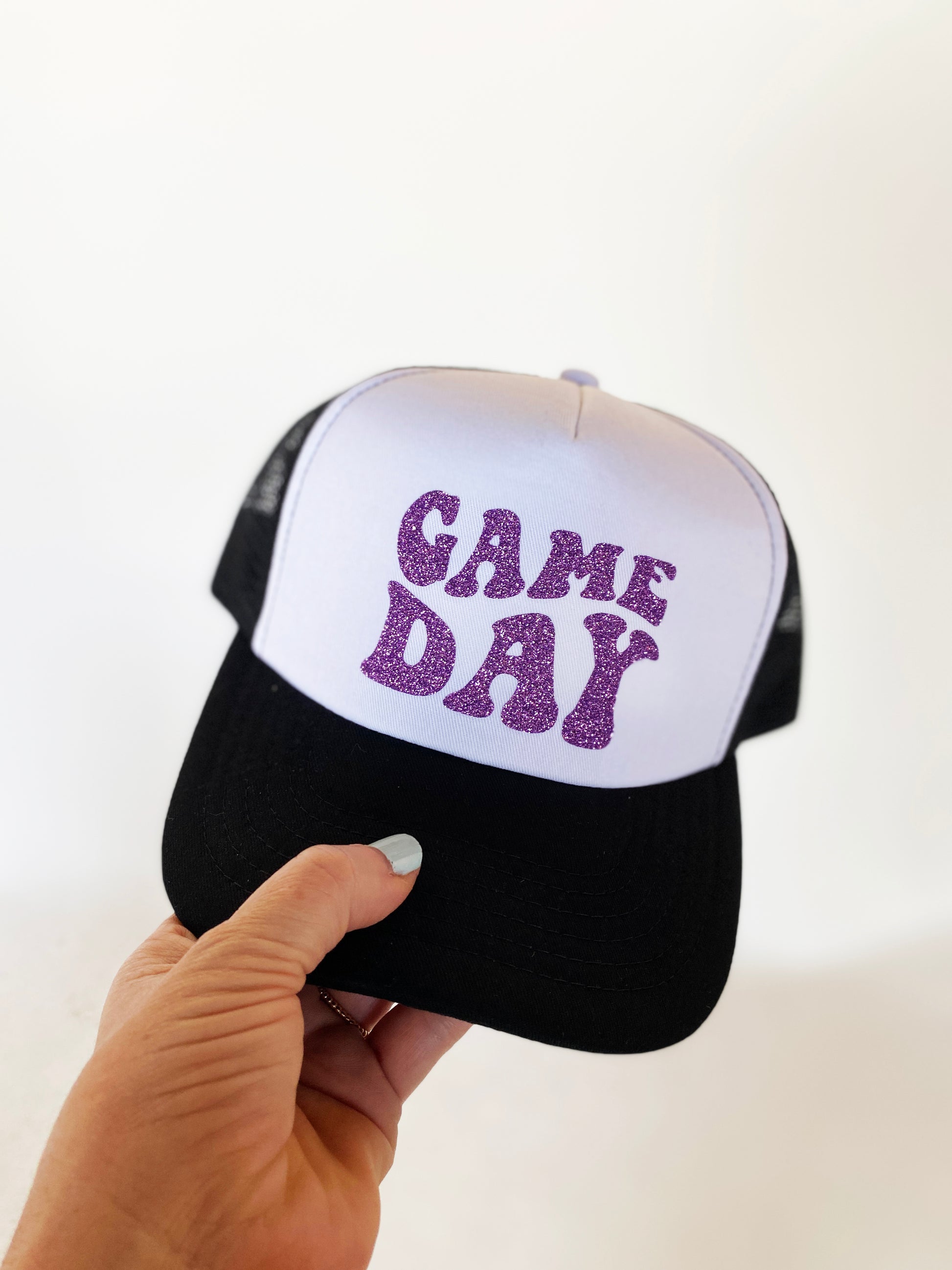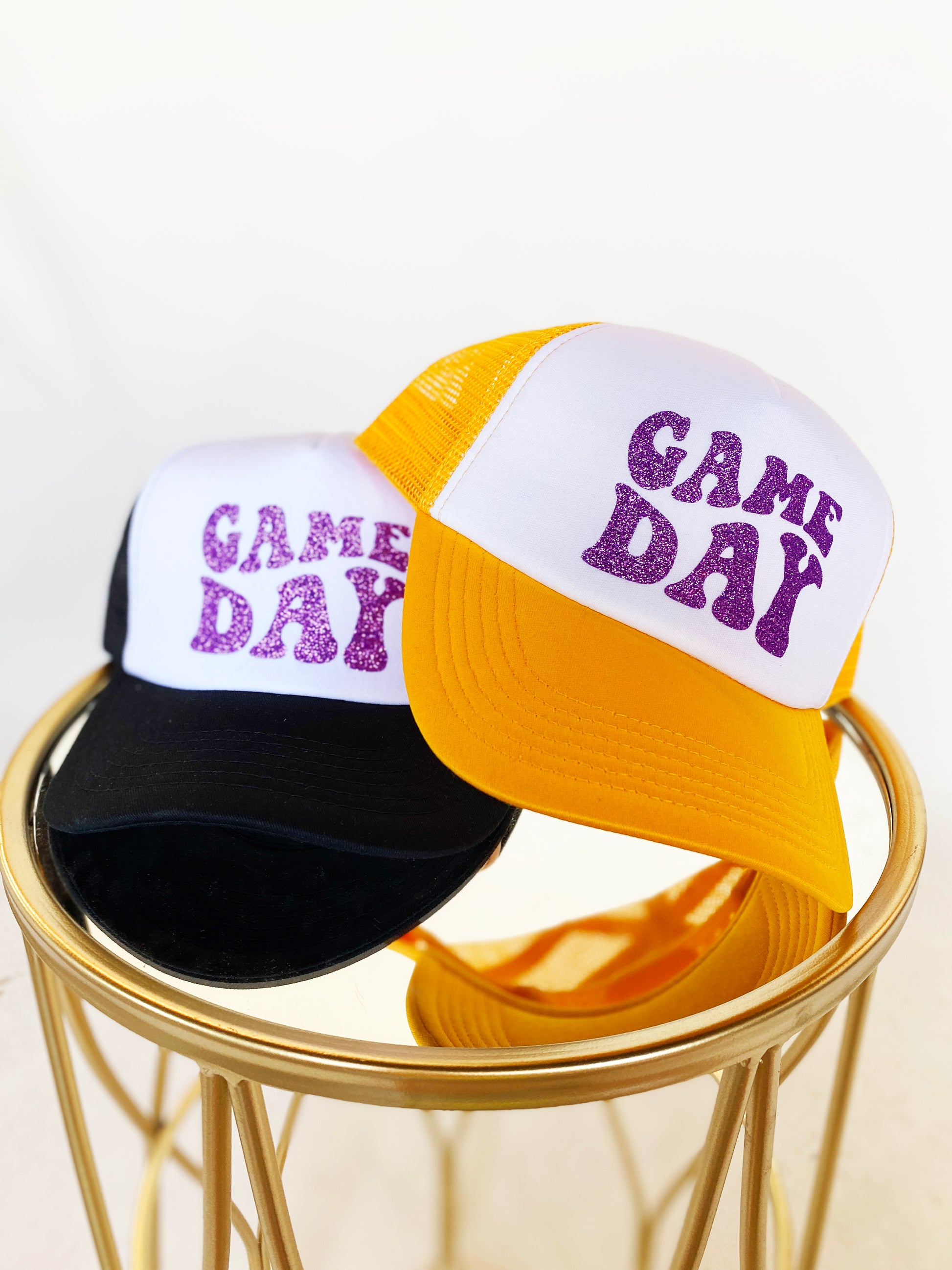 Gameday Wavy hat features wavy retro gameday artwork on front of trucker hat.