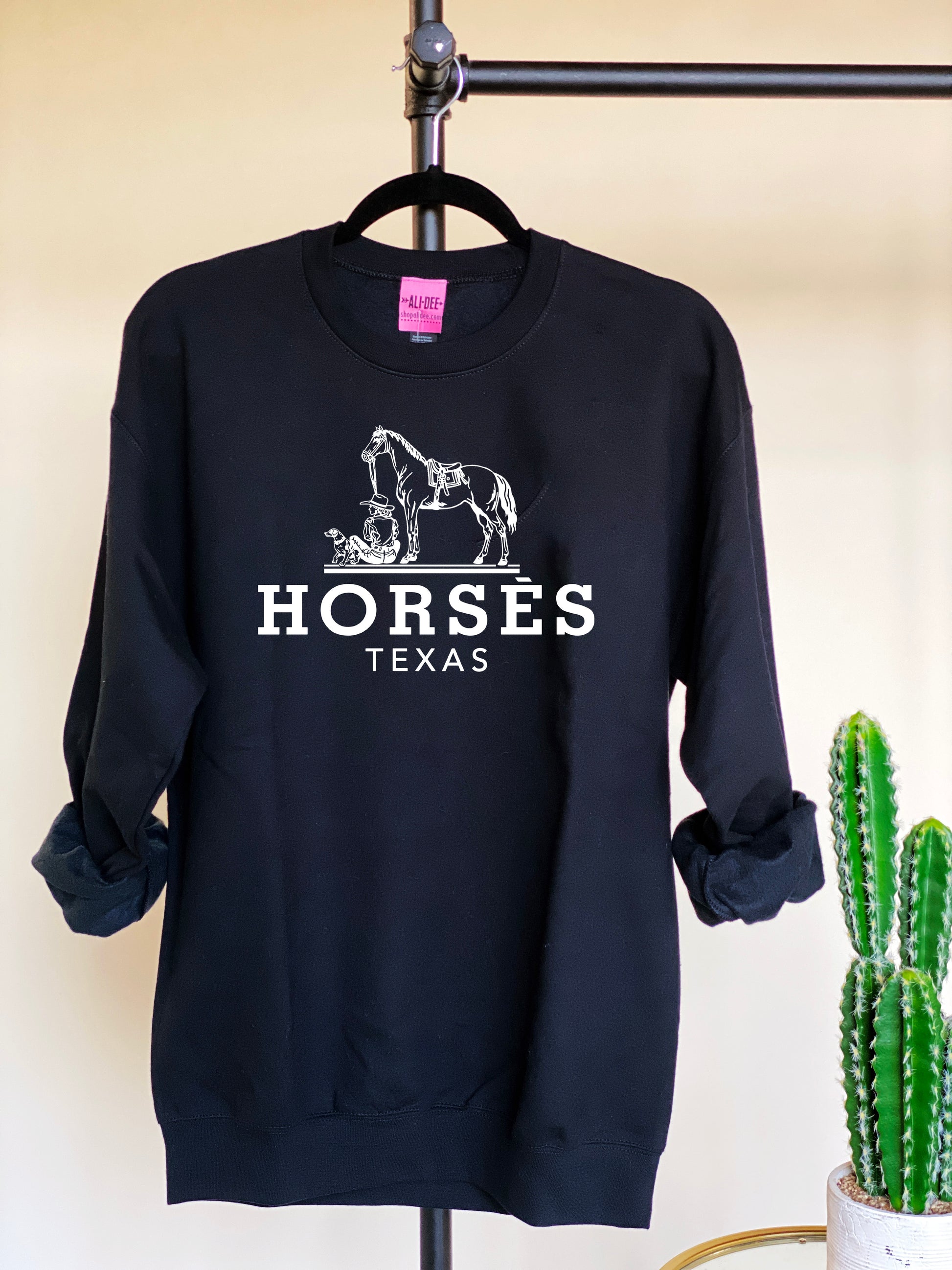 HORSES Luxury Inspired Graphic Sweatshirt from Ali Dee features a super soft unisex body crewneck in black with white graphic art.