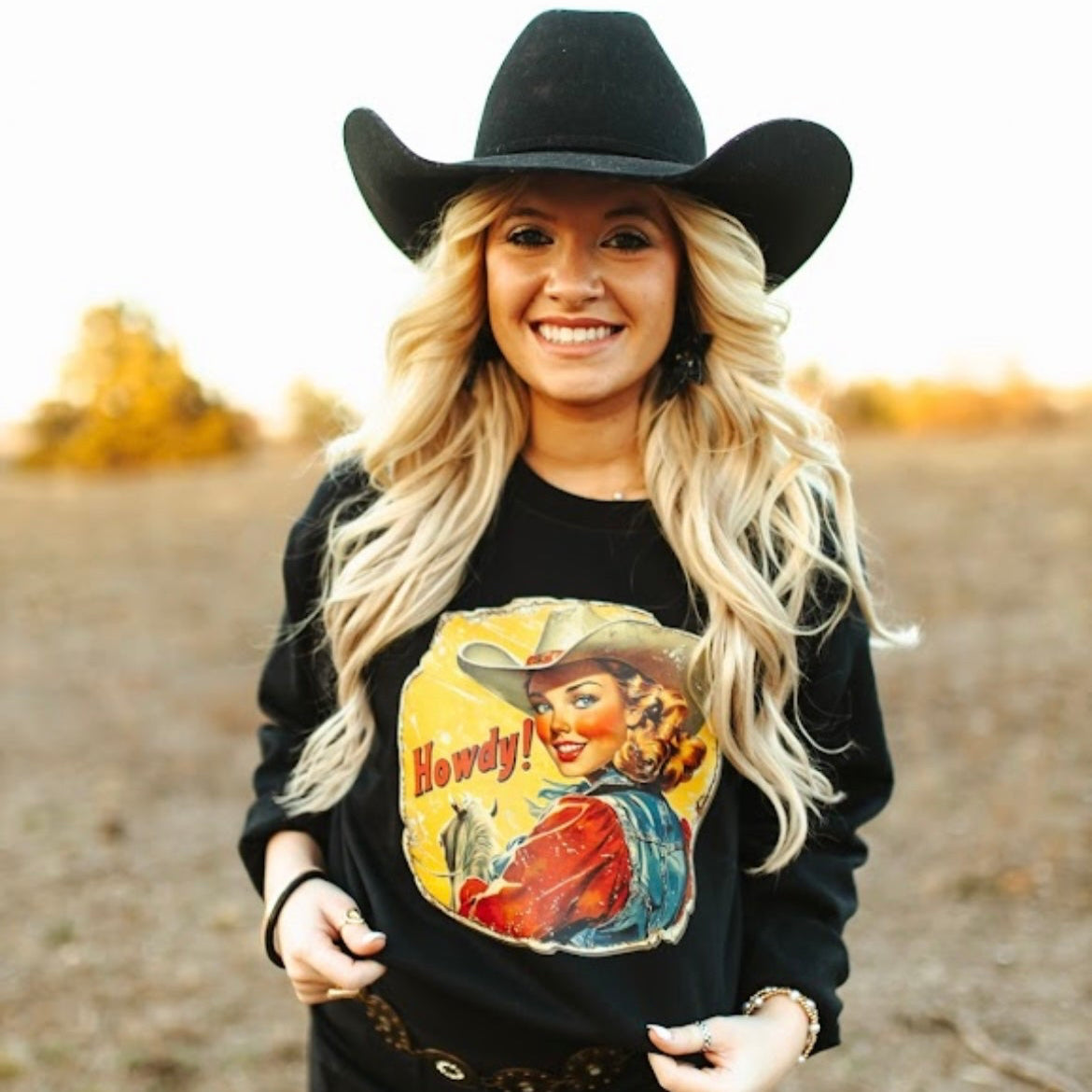 Howdy! graphic sweatshirt by Ali Dee features a unisex fit sweatshirt in black with full color art.