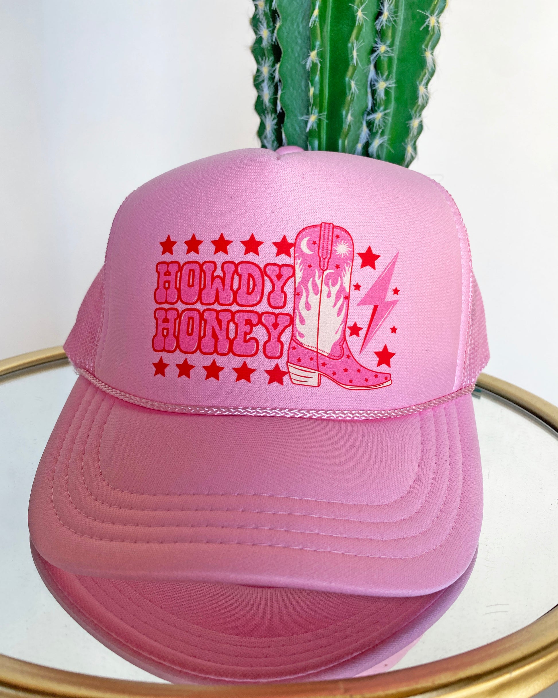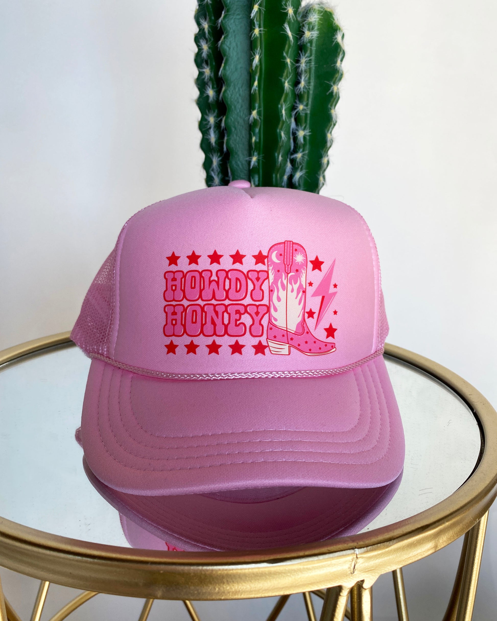 Solid Pink Trucker hat with mesh back adjustable snap with Howdy Honey full color art.