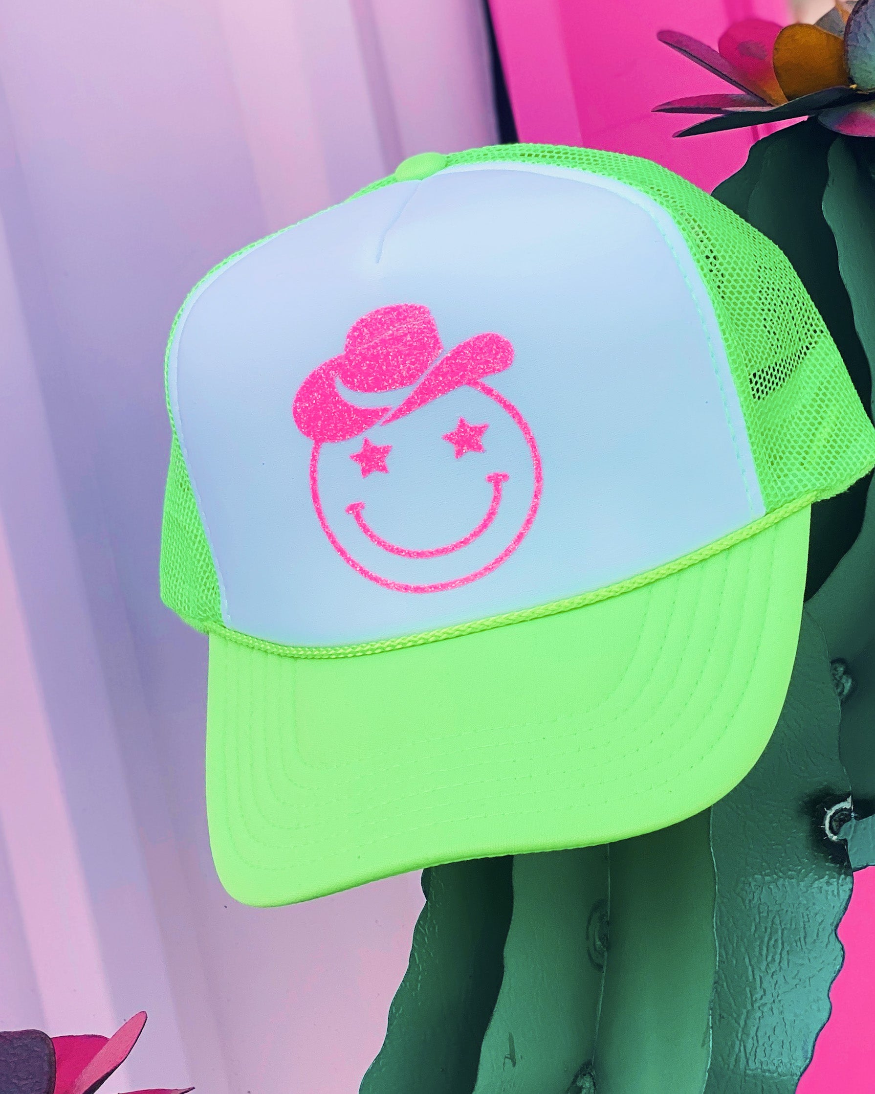 Neon Green and white foam front mesh back adjustable snap trucker hat with pink glitter Howdy Smiley embellishment.