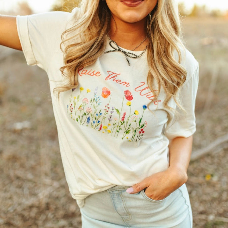 Raise Them Wild western graphic tee by Ali Dee features a unisex fit body in natural with full color art.