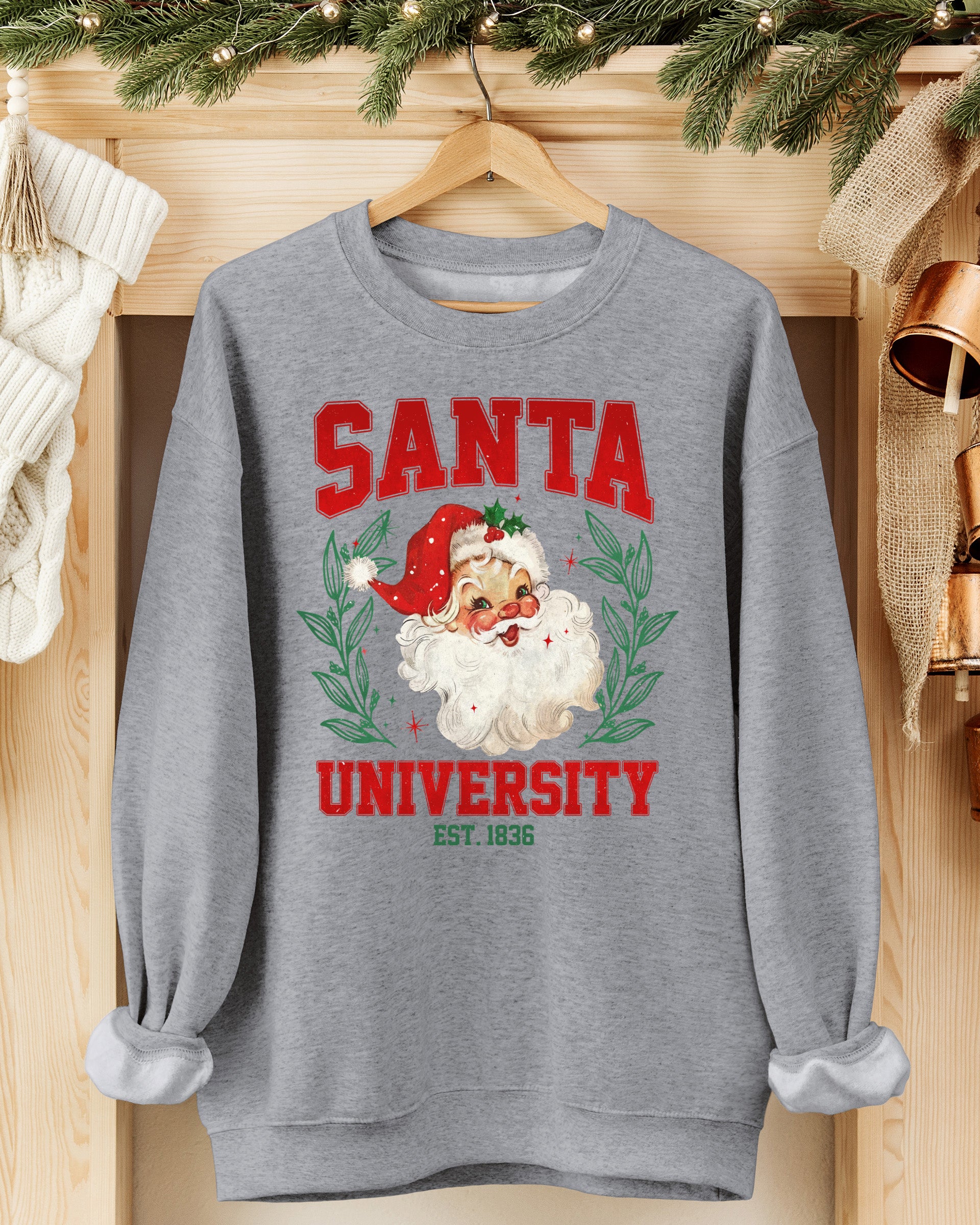 Santa University Graphic Sweatshirt from Ali Dee features a super soft unisex body crewneck in grey with full color graphic art.