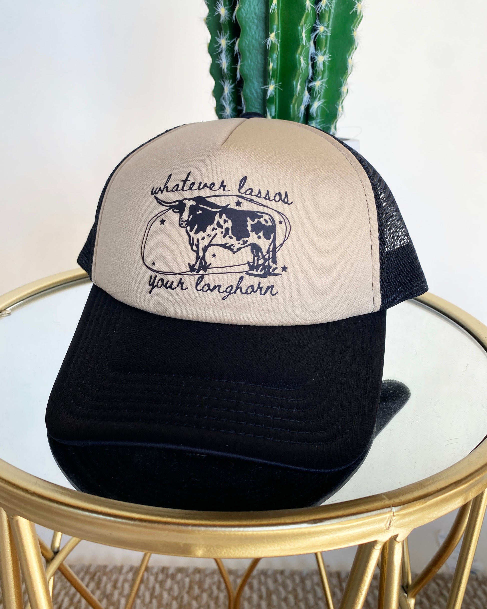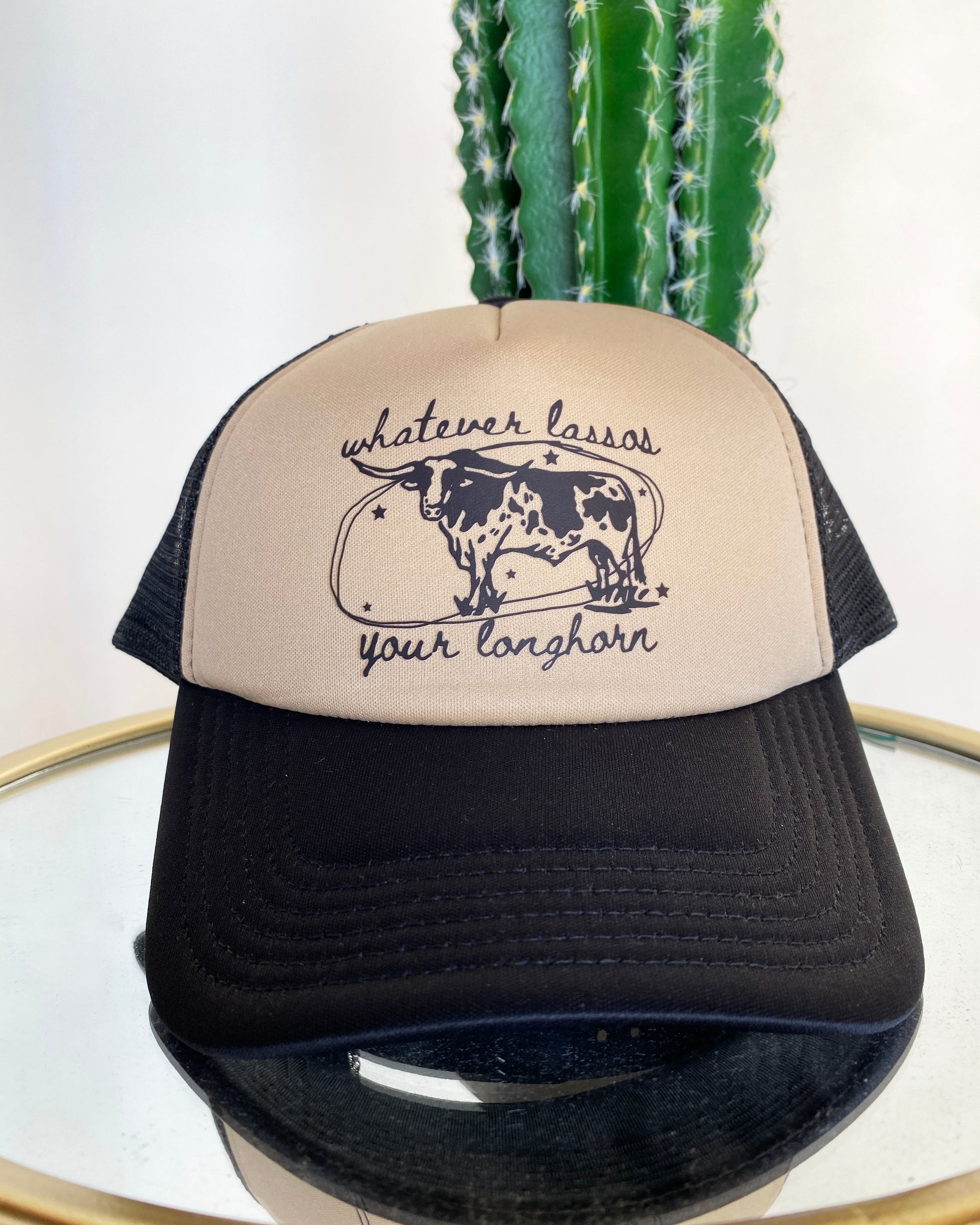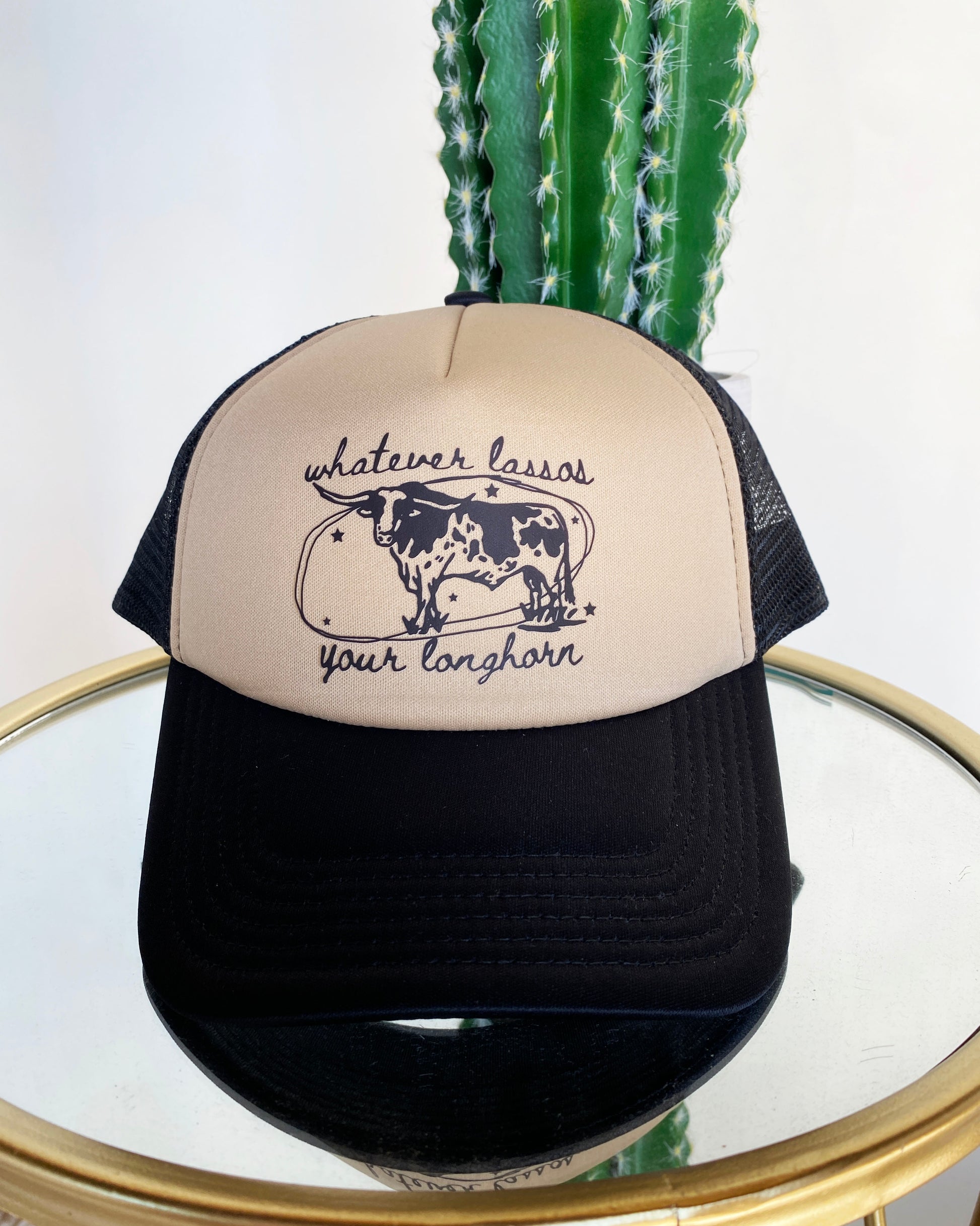 Whatever Lassos Your Longhorn Trucker Hat by Ali Dee - Black and Tan